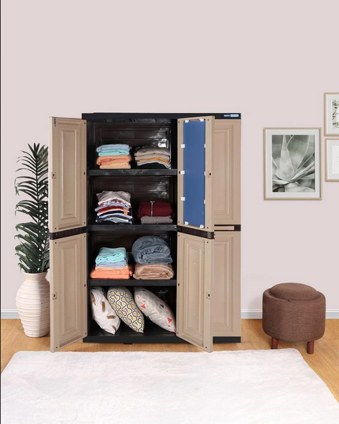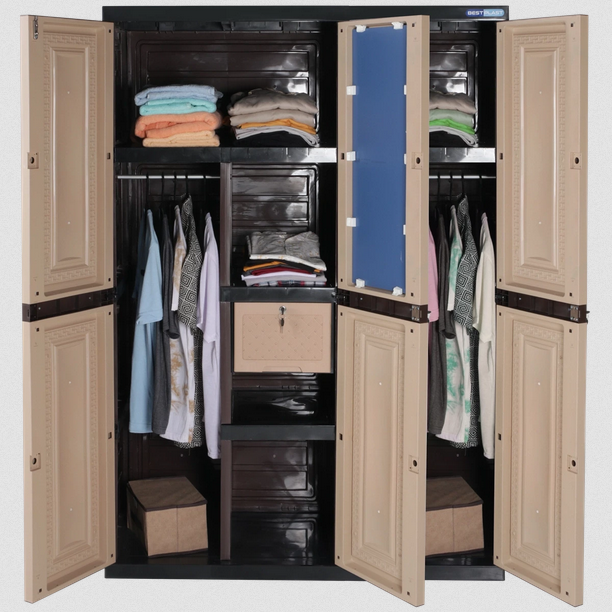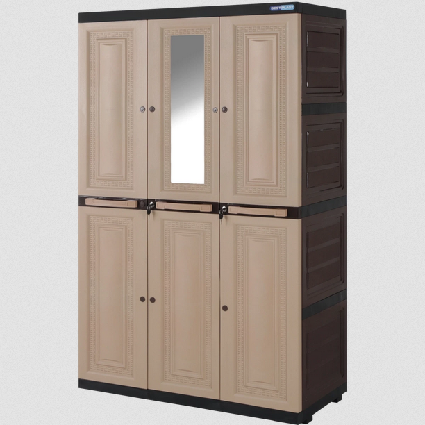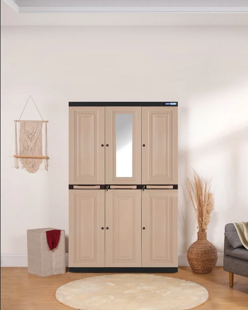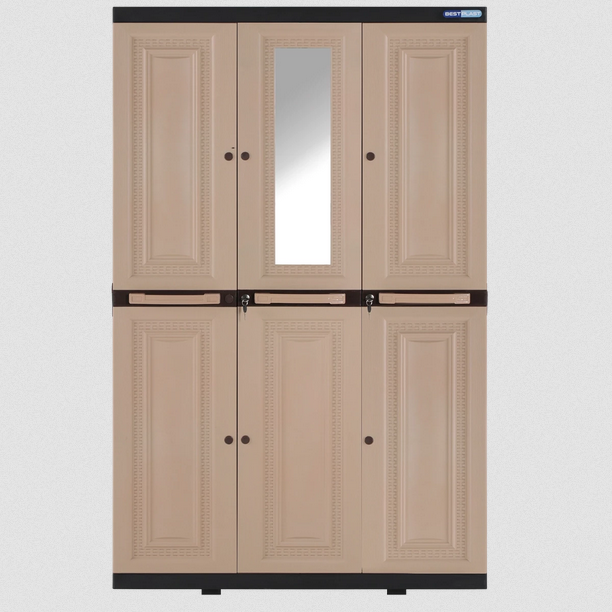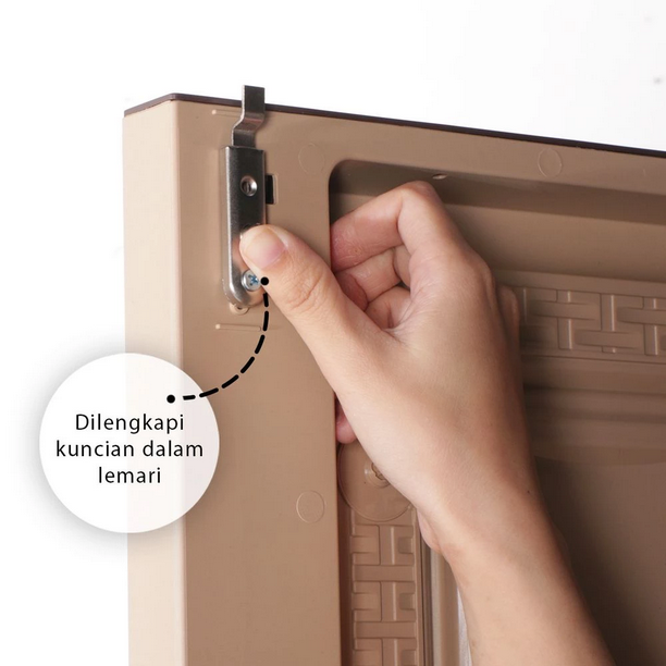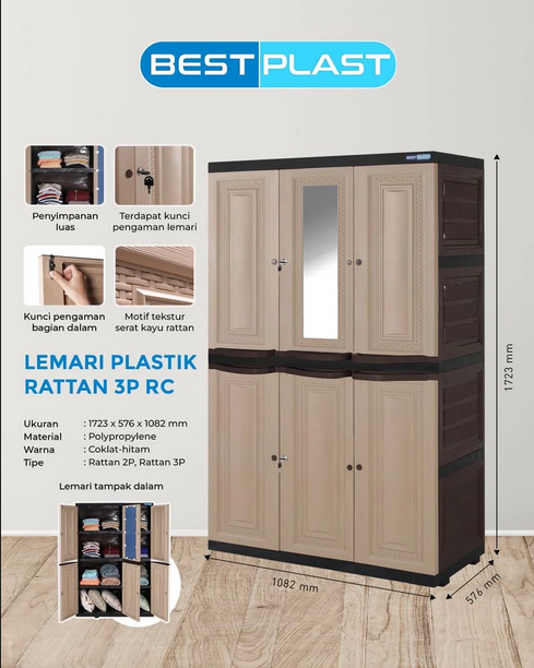 Lemari pakaian 3 pintu motif rattan dengan rak penyimpanan luas, serta gantungan baju aluminium. Dilengkapi kuncian pengaman, memiliki konstruksi yang kokoh, dan komponen yang tidak mudah lepas.